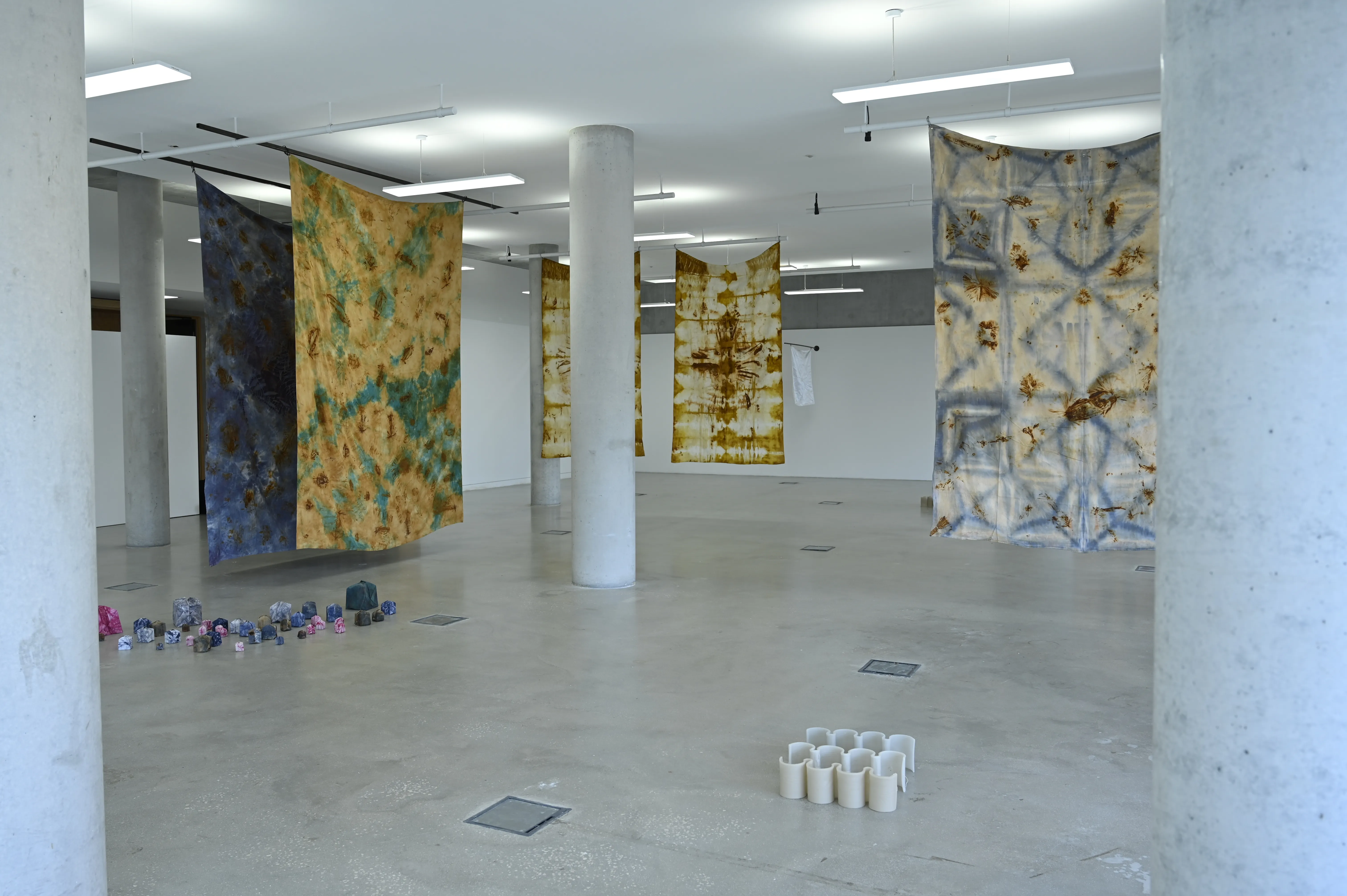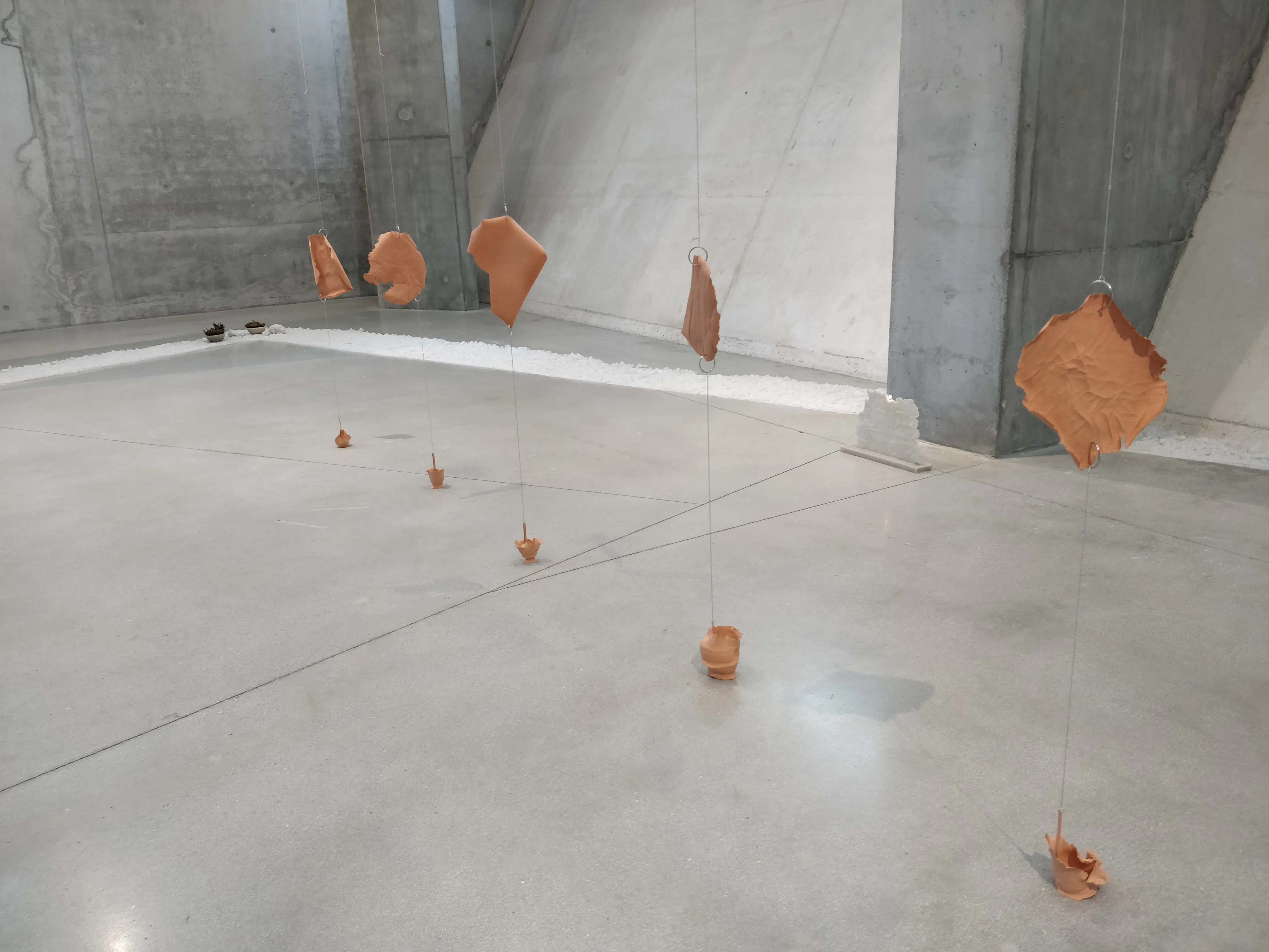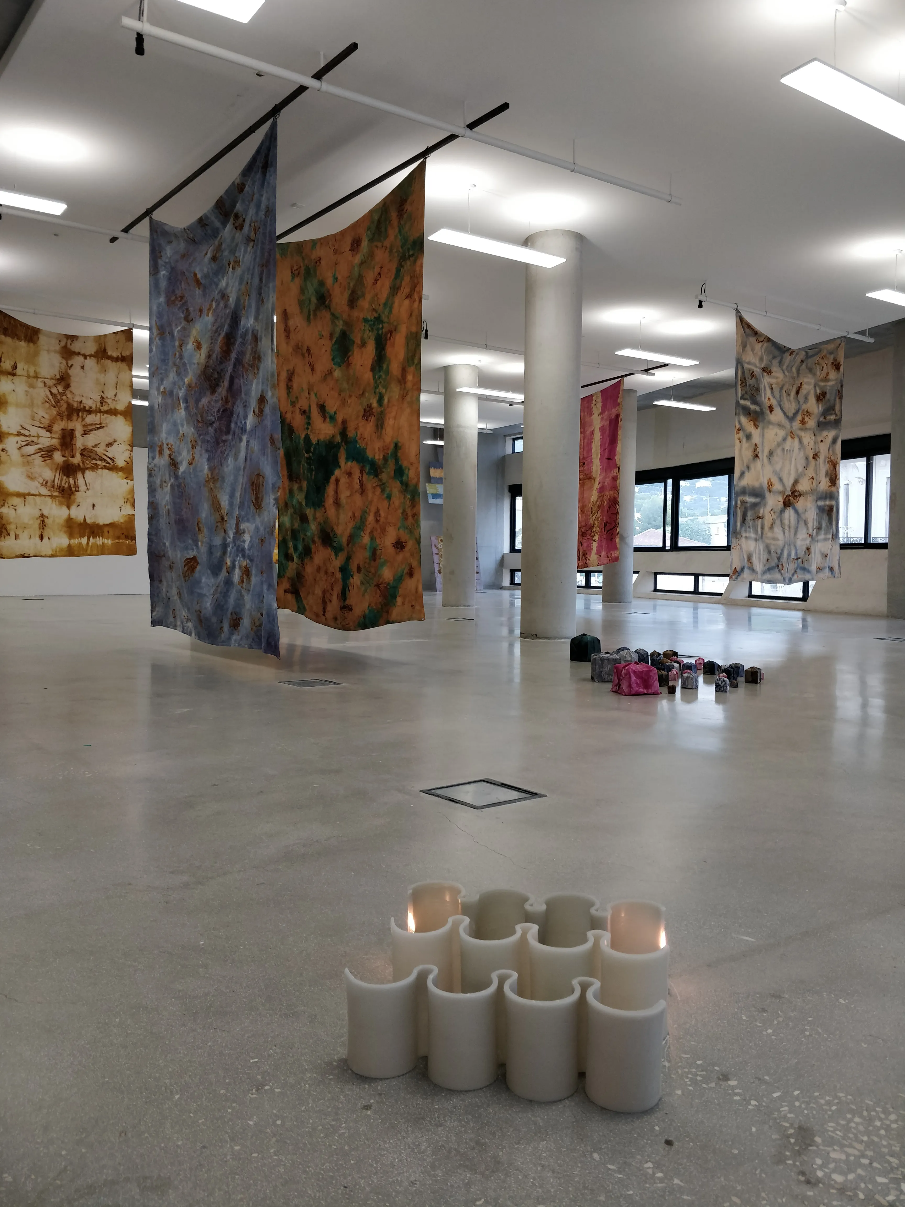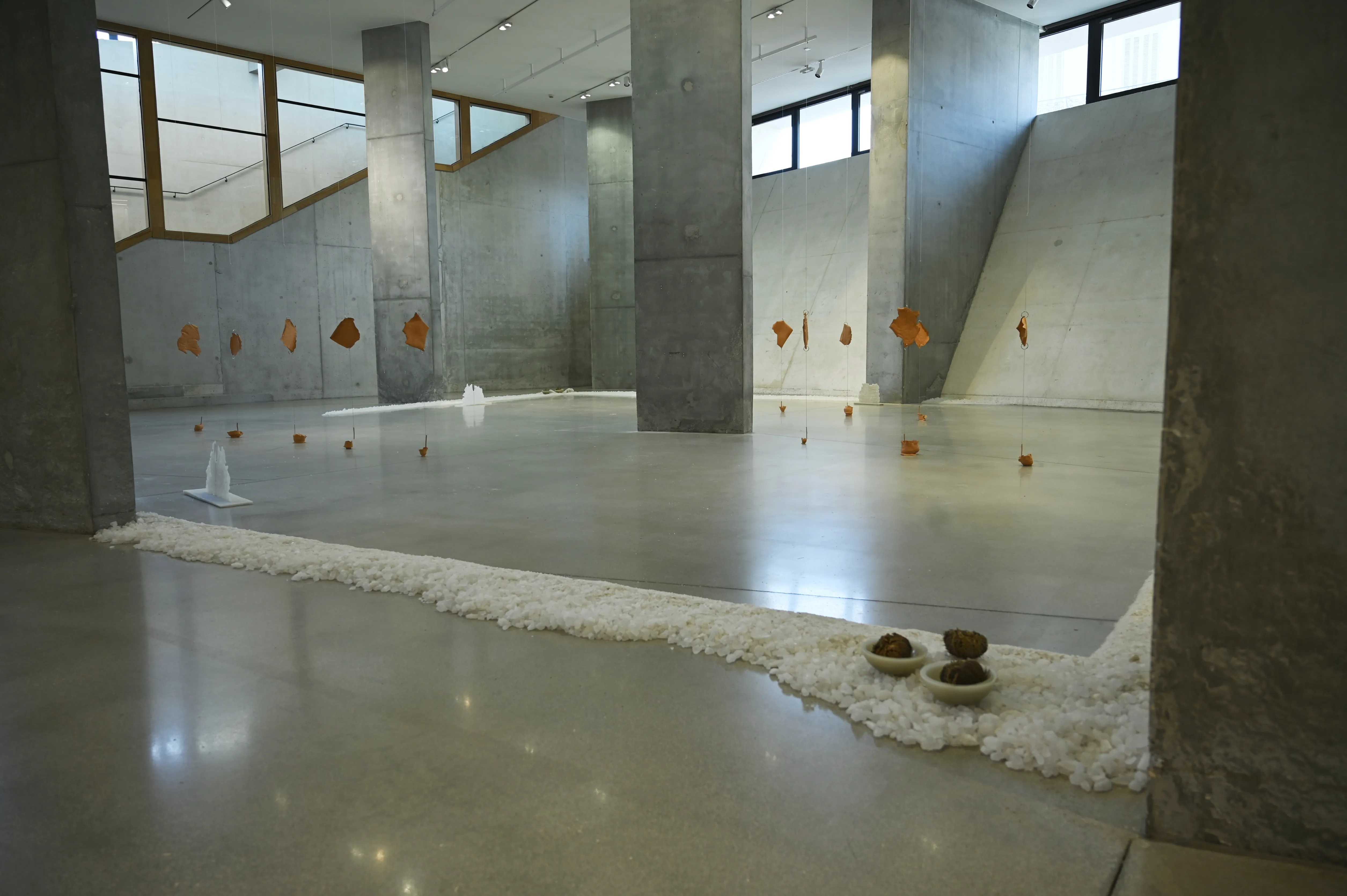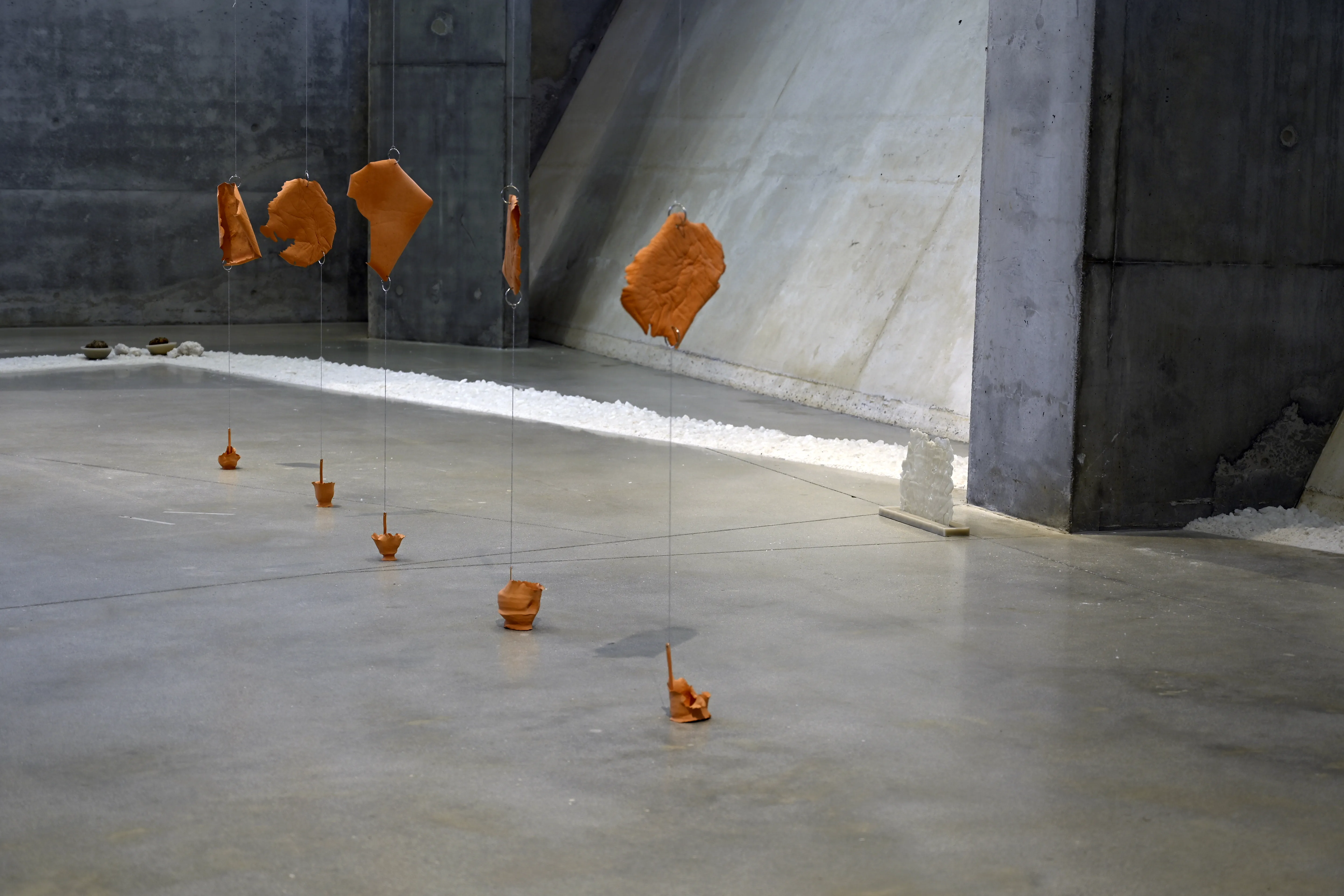 L’exposition Les racines de toutes choses explore la relation intime entre la matière, la transformation et le temps. En se référant à la théorie des quatre éléments (terre, eau, air, feu) qui, selon Empédocle, sont le fondement de toute existence. À travers une diversité de médiums, l’artiste interroge la fragilité, l’équilibre et la résilience des matériaux, tout en mettant en lumière leur potentiel organique et polymorphe. Les œuvres créent un espace d’interprétation visuelle, invitant le spectateur à une lecture personnelle et contemplative, une réflexion sur l’adaptation et la temporalité des matériaux. Les sculptures en cire, qui évoluent sous l’effet du feu, illustrent la transformation constante, le cycle infini de création et de destruction. Ces œuvres deviennent des métaphores de interaction entre le corps humain et son environnement, questionnant le renouvellement des formes et des forces naturelles. Les recherches sur la transformation et la plasticité des matériaux offrent une contemplation poétique du temps et de la matière. L’exposition souligne ainsi la fragilité et l’harmonie, soulignant les liens invisibles entre l’humain, la nature et l’art. Le concept japonais de Ma, fil conducteur de l’exposition, incarne la quête d’un équilibre subtil entre le corps et l’environnement, l’objet et le spectateur, redéfinissant ainsi le rapport à l’espace, à la matière et à l’éphémérité de l’existence. Les racines de toutes choses rend hommage à la transformation, à la mémoire et à la réincarnation des formes à travers les cycles du temps.